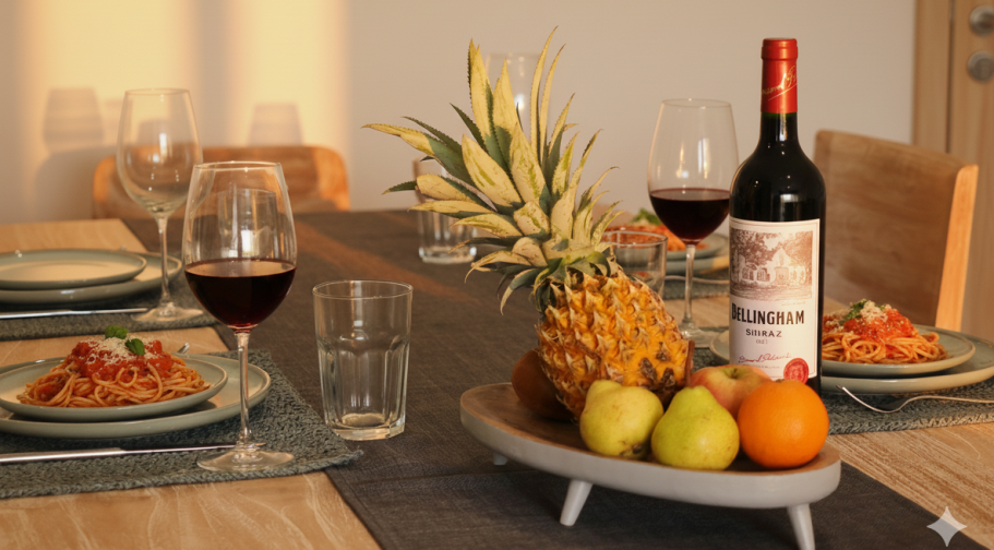 Ein gedeckter Tisch im goldenen Abendlicht – hier wird jedes Essen zum Genuss. Feiner Wein, frische Früchte und mediterrane Aromen schaffen eine Atmosphäre voller Wärme und Lebensfreude.
